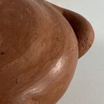 The slight turning of the head to the viewer’s left throws the form of canteen 2025-14 off-balance and gives this personage a life-like and energized visage. She (?) seems to be listening. This is a friendly person I’d like to get to know. Her protruding belly suggests she might be pregnant. The contrast between the rough surface of the neck, head and arms and the polished body also adds interest.